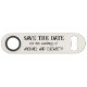 Unique wedding Save the Date stainless steel bottle opener. Text on one side says, "Cheers to love and forever." Personalise with the names of the bride and groom-to-be, their wedding date, and location. The other side says, "Save the Date" and is personalised with the happy couple's names These make great favours for your engagement party.