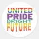 "United Pride Bright Future" in a bold, multicolored design. The text is the main focus, taking centre stage on the sticker Imagine a vibrant spectrum of colours splashed across the words, creating a sense of unity and optimism. There are no images of people on this design, letting the powerful message stand alone.