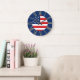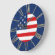 This sophisticated wall clock features a patriotic American theme. The centre features an image of the flag of the United States of America, with the red and white stripes and white stars over a navy blue banner. The outer circle of the clock features a matching navy blue background and the hours are printed in Roman numerals with a faux gold foil design.