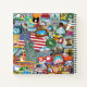 This design features a collage of stylised retro and vintage travel stickers with landmark graphics.