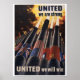 Vintage World War II poster "United We Are Strong ~ United We Will Win" by Henry Koerner, 1943, showing guns blazing whilst wraped in the flags of the allied nations.