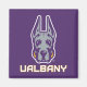 The University at Albany Great Dane mascot logo features a stylised depiction of a Great Dane's head. The dog is illustrated with sharp, bold lines in purple and grey, giving it a fierce, confident expression. The ears stand tall, symbolising alertness and strength. Underneath the Great Dane head is the word "UAlbany" written in bold, blocky golden letters outlined in purple, reinforcing the university's branding. This design represents UAlbany's sports teams, highlighting power, loyalty, and determination.