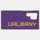The University at Albany wordmark features bold, geometric typography in purple with gold outlines. The text is written in all capital letters, forming a strong and modern style that emphasizes the university's identity. The angular lines and sharp edges of the font create a sense of power and professionalism. The gold outline adds a touch of prestige and visibility, making the wordmark stand out on both light and dark backgrounds. This design is perfect for branding athletic teams, merchandise, and university-related media.