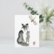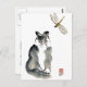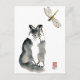 Kitten is playing in the yard by the water feature when in zooms a dragonfly - an unpalatable insect. Sumi-e, Zen ink painting by Ellen Miffitt aka Nine Lives Studio