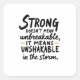 A powerful typography design featuring an inspiring quote about resilience and true strength. The message reads: "Strong doesn't mean unbreakable, it means unshakeable in the storm." This design celebrates the ability to remain steadfast and unyielding when facing life's challenges. Perfect for motivation, self-improvement, or for anyone needing a reminder of their inner toughness. It uses a bold, hand-drawn brush script font on a simple background to maximise impact.