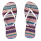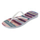 These fun and colourful hand knitted flip flops have a retro appearance, the knitted striped image is taken from a photograph of an original hand knitted blanket pattern. The knitted stripey blanket has been photographed to show it looking natural and "pre-loved" you may even see a few pet hairs! and there will be bobbly bits, stray threads and maybe a dropped stitch or two, this all makes up the natural look of a pre-loved piece of knitting on these flip flop sandels. The natural look of the image give the flip flops a quirky vintage appearance.