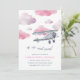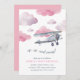 Up, up, and away! Our vintage aeroplane kids birthday invitations feature a watercolor biplane flying through fluffy pink clouds. Personalise with your birthday party details beneath. Cards reverse to solid pale pink. A perfect choice for future pilots and budding aviators!