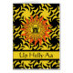 Up Helly Aa, Shetland fire festival greeting card with a sun and fire design. The Guizar Jarl is centred inside the sun floating in a fiery sky design. A celebration with a Norse Scandinavian theme held in late January. Art, image, and verse copyright © Shoaff Ballanger Studios, 2023.