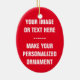 Upload your family photo, favourite image, text, pet cat, dog photo and create your own personalised photo Christmas ornament. Create both sides with same photo or multiple photos and personalise with custom name, year and other text .text. Style: Ceramic oval Ornament. Displayed has Christmas green and red colour on each of the two sides but you can personalise it with same colours, any colour-on-colour pallet. Home & Living > Home Décor > Holiday Accents > Ornaments