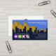 Four placards sit at the base of the card showing the modes for logistics transport with a slogan option above. All this against a creative urban city setting with building silhouettes as a background cover. Your name and job title sit at the top whilst near the base are the contact details.