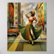 The artwork is blending with the elegance of 1950s fashion and city life.