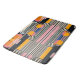 Art Deco and Bauhaus-inspired aesthetic, with a structured balance of vertical stripes and geometric shapes. The mix of bold mustard yellow, deep teal, soft pink, and black creates a strong contrast, making it both modern and timeless.