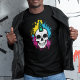 This graffiti-inspired street art design features a white skull with a bright green mohawk. Bright yellow, blue, and pink paint-like splotches form the background. Great for skull or horror lovers and those who enjoy the goth or punk aesthetic.