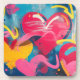 This vibrant graffiti artwork captures the essence of love with an explosion of colourful hearts against a dynamic blue background. The overlapping shades of pink, yellow, red, and orange hearts, combined with splashes and drips of paint, create a lively and passionate scene, embodying the spirit of street art and romance.