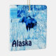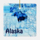 A blue and white image of a cow moose in an urban setting during winter. Customisable text reading "Alaska" also appears. Moose are year-round residents in many Alaskan communities. Here in Anchorage there are about 1500 animals, along with wolves, brown bears and other wildlife.They are usually well-behaved. They often cross streets at the crosswalks after waiting for a walk signal.