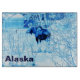 A blue and white image of a cow moose in an urban setting during winter.  Text reading "Alaska" also appears. Moose are year-round residents in many Alaskan communities. Here in Anchorage there are about 1500 animals, along with wolves, brown bears and other wildlife.They are usually well-behaved. They often cross streets at the crosswalks after waiting for a walk signal. From a photo of a moose which wandered through my yard.