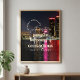 This poster shows a bright city skyline reflecting on the water during the night. The design uses a mix of different fonts to make the words stand out against the dark sky and tall buildings. Some of the words curve in a circle at the top, while others are big and bold right in the centre. The red and pink lights from the skyscrapers add a splash of colour to the deep blue and black background. It is a clean and straightforward layout that looks great on any wall where you want to see a beautiful urban view and a kind reminder.