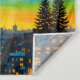 A mesmerising night scene featuring a glowing city skyline beneath a cosmic, star-filled sky. The golden windows contrast beautifully against the deep blues and greens of the night. A winding road and towering pines add depth to this serene urban landscape.