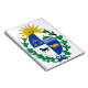 It consists of an oval shield, which is divided into four equal sections and crowned by a rising golden sun, the “Sun of May”, symbolising the rising of the Uruguayan nation and the May Revolution. The oval is surrounded by a laurel branch on the left and an olive one on the right, representing honour and peace, joined at the bottom by a light blue ribbon, the former uruguayan cockade.