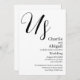This elegant, modern wedding invitation features a black and white theme. The title "Us" is printed in a large script font at the top, above the couple's names getting married. The wedding information is printed below in a sophisticated black font.