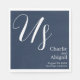 These elegant, romantic wedding napkins feature a navy blue theme. The title "Us" is printed in a large script font at the top, above the couple's names getting married. The wedding information is printed below in a sophisticated, modern, white font.