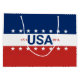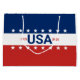 Celebrating the USA's 250th anniversary. This red, white, and blue gift bag has the word 'USA' in the center. The years 1776 and 2026 are next to USA. The top stripe is blue and has white stars. The center stripe is white. The bottom stripe is red with white stars.