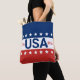 Celebrating the USA's 250th anniversary. This red, white, and blue tote bag has the word 'USA' in the centre. The years 1776 and 2026 are next to USA. The top stripe is blue and has white stars. The centre stripe is white. The bottom stripe is red with white stars.