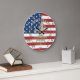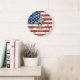 The clock face features the bold and recognizable design of the American flag, with vibrant red and white stripes and a deep blue field filled with stars forming a powerful patriotic backdrop. Surrounding the design are elegant gold Roman numerals that bring a timeless and classic look while making the clock easy to read from any distance.