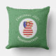 A red haired angel wears the flag of the United States of America on this outdoor pillow for holiday decorating or Christmas decor. The USA Flag Christmas angel is found inside a white circle of squiggly squares. The background is green squiggly squares. Add your own text or personalise with a name and the year.
