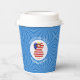 Paper cups with lids for your Hanukkah party have a red haired angel wearing the flag of the United States of America for holiday decorating or decor. The USA Flag angel is found inside a white circle of squiggly squares. The background is a blue fractal of squiggly squares. Add your own text or personalise with a name and the year.