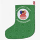 An African American angel wears the flag of the United States of America on this Christmas decor large Christmas stocking. The African American USA Flag Christmas angel is inside a white circle of squiggly squares, surrounded by a background of green squiggly squares. Add your own text or personalise with the year and a name.