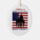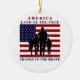 Beautiful American patriotic round tree ornament. This design is available on other shape ornaments as well. A wonderful way to show your American patriotic pride and support for U.S. troops, or to add to your patriotic ornament collection. The design features an American flag background, with a silhouette of soldiers in front. The main colours are red, white and blue and black. The ornament front reads, America... Land of the free.. Thanks to the brave.. The back reads, Merry Christmas and the year. You may edit back text in template area on this page. Please visit our store for other patriotic gifts and patriotic holiday items, shirts, and greeting cards, in different, styles, designs and colours.