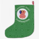 A red haired angel wears the flag of the United States of America on this large Christmas stocking for holiday decorating or Christmas decor. The USA Flag Christmas angel is found inside a white circle of squiggly squares. The background is green squiggly squares. Add your own text or personalise with a name and the year.