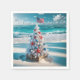A white Christmas tree adorned with blue and red decorations stands on a sandy beach, with an American flag on top