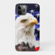 This phone case features a portrait of a fierce American bald eagle in front of the star spangled banner. At the bottom is your name or other custom text in grey. If you prefer, you may remove the text by clearing the field. Patriotic and beautiful!