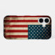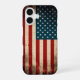 The American flag is depicted with red and white stripes and a blue field with stars, all presented in a distressed, grunge style. The red stripes are deep and uneven, the white stripes appear faded and stained, and the blue field has specks and scratches. The stars are rugged yet recognizable, blending into the worn texture. This grunge esthetic emphasizes the flag’s historical and symbolic weight, creating a powerful and dynamic visual statement.
