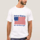 An editable title and slogan accompanies the red and white stripes with white stars on blue canton of the American flag on the front of this t-shirt. The back displays a detailed map of USA.