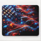 A vibrant depiction of the American flag features swirling patterns of red, white, and blue, with stars set against a dynamic background