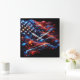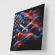 A vibrant depiction of the American flag features swirling patterns of red, white, and blue, with stars set against a dynamic background.