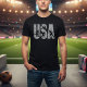 Show your USA pride with this dynamic soccer fan t-shirt featuring player action silhouettes integrated into bold USA lettering with distressed vintage texture. Perfect for the global football tournament 2026 hosted in USA, watch parties, tailgating, fan zones, and supporting Team USA during international matches and home games.