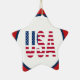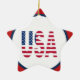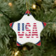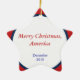 Red, whhite and blue patriotic Christmas ornament with USA in the centre, in a stars and stripes motifon the front. On the back, the words "Merry Christmad, America" and "December 2010," both of which can be changed if desired.