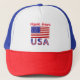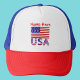 Personalised trucker hat featuring the flag of the United States of America, or, American flag with the letters USA below in the red, white and blue with stars and stripes, found in the flag. Personalise the trucker hat by adding a name, for yourself or a creative gift. Great for travel groups, clubs, or family reunions. Fun gift for any occasion or event. Dad would love it for Father's Day. Fun to wear on Independence Day/4th of July.