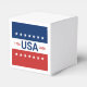 Celebrating the USA's 250th anniversary. This red, white, and blue favor box has the word 'USA' in the center. The years 1776 and 2026 are next to USA. The top stripe is blue and has white stars. The center stripe is white. The bottom stripe is red with white stars.
