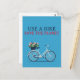 This is a blue-dominant postcard with a bicycle illustration, flowers and the customisable "use a bike save the planet" motto. This is a great card that builds awareness about environment.