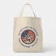 Budget tote bag features Pro Democracy typography graphic of patriotic coloured centre Liberty Statue badge graphic with circular text that reads "Use your voice, use your vote, save democracy and vote blue.