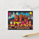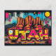 Postcard from the state Utah, USA! This postcard in graffiti style features an a big UTAH script in yellow pink, in front of the abstract Monument Valley and Wasatch mountains.