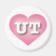 This magnet features a pink heart with a white-washed centre containing the bold, white upper case letters UT, the official abbreviation for Utah, the beehive state.