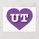 This postcard features a vibrant purple heart containing the bold, white, upper case letters UT, the official abbreviation for Utah, the beehive state. The reverse side of the postcard is blank, awaiting your handwritten sentiments or customised text. Choose font style, size, and colour.