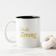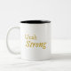 Prominently displayed on the front of the mug is the bold, stylish typography spelling out "Utah Strong" in striking golden letters. The use of gold accents adds a touch of luxury and prestige, elevating the mug's visual appeal and making a powerful statement. The choice of font reflects modern design sensibilities, with sleek sans-serif characters that convey a sense of strength and resilience.