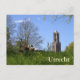 Photo of two people sitting on a bench in a park in Utrecht (the Netherlands), with a view of the Dom church tower.